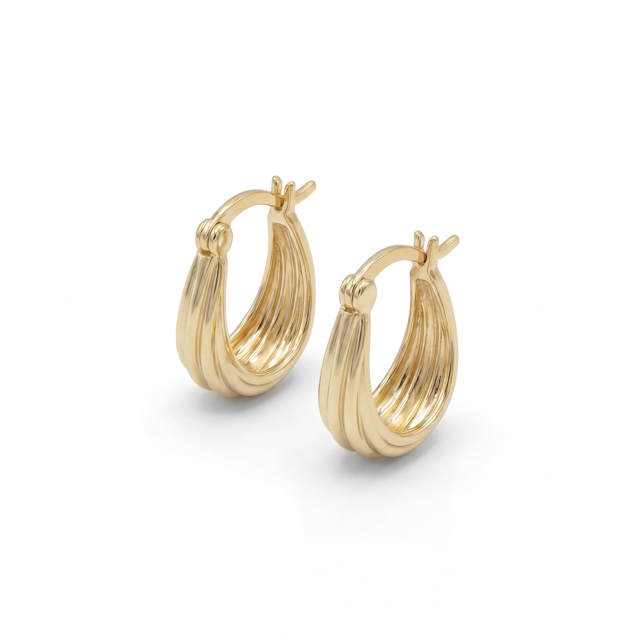 The compact size makes these small hoops the ideal everyday companion that transitions effortlessly from casual to elegant occasions.These huggie hoops feature an innovative ribbed surface structure that creates subtle light play throughout the day, catching attention without overwhelming.