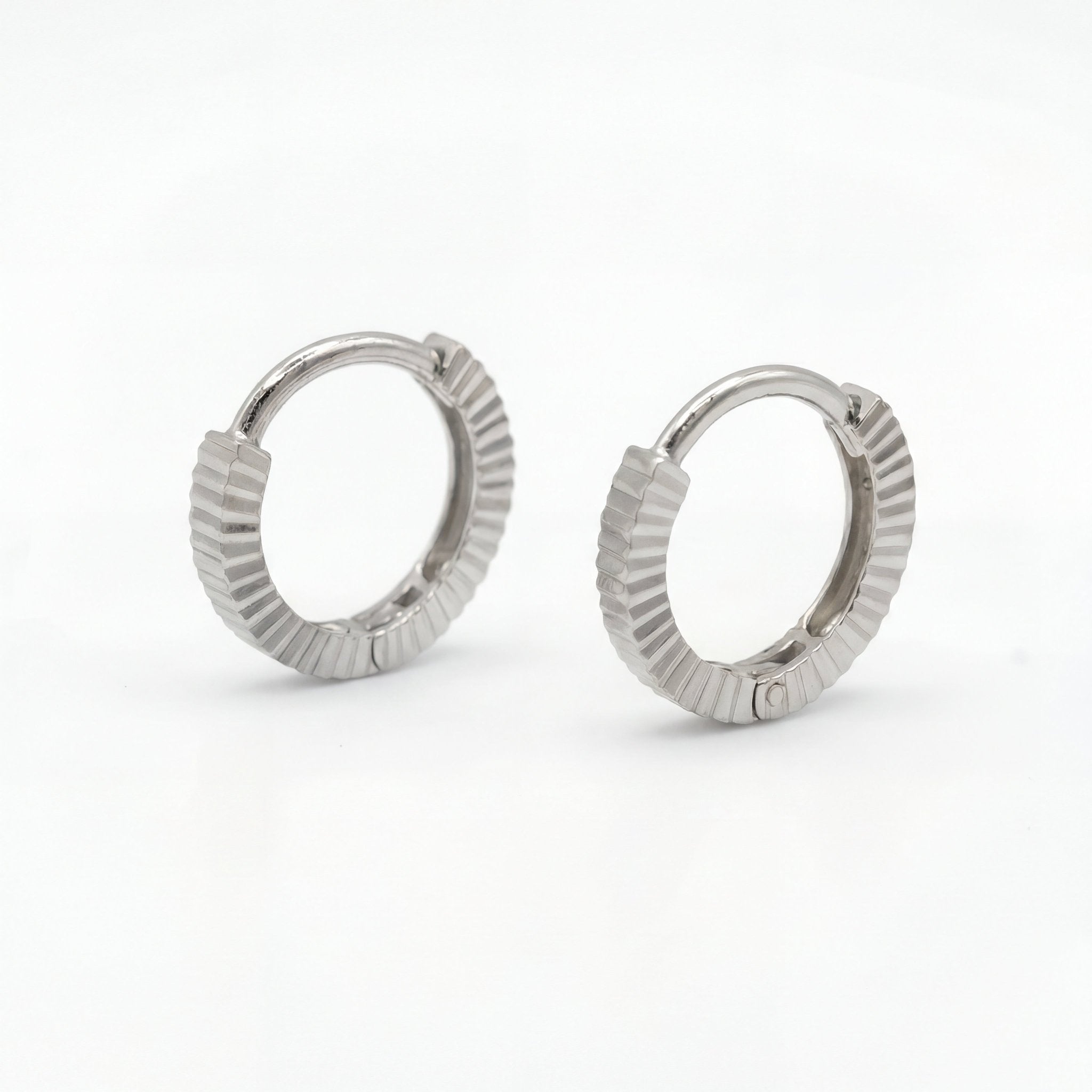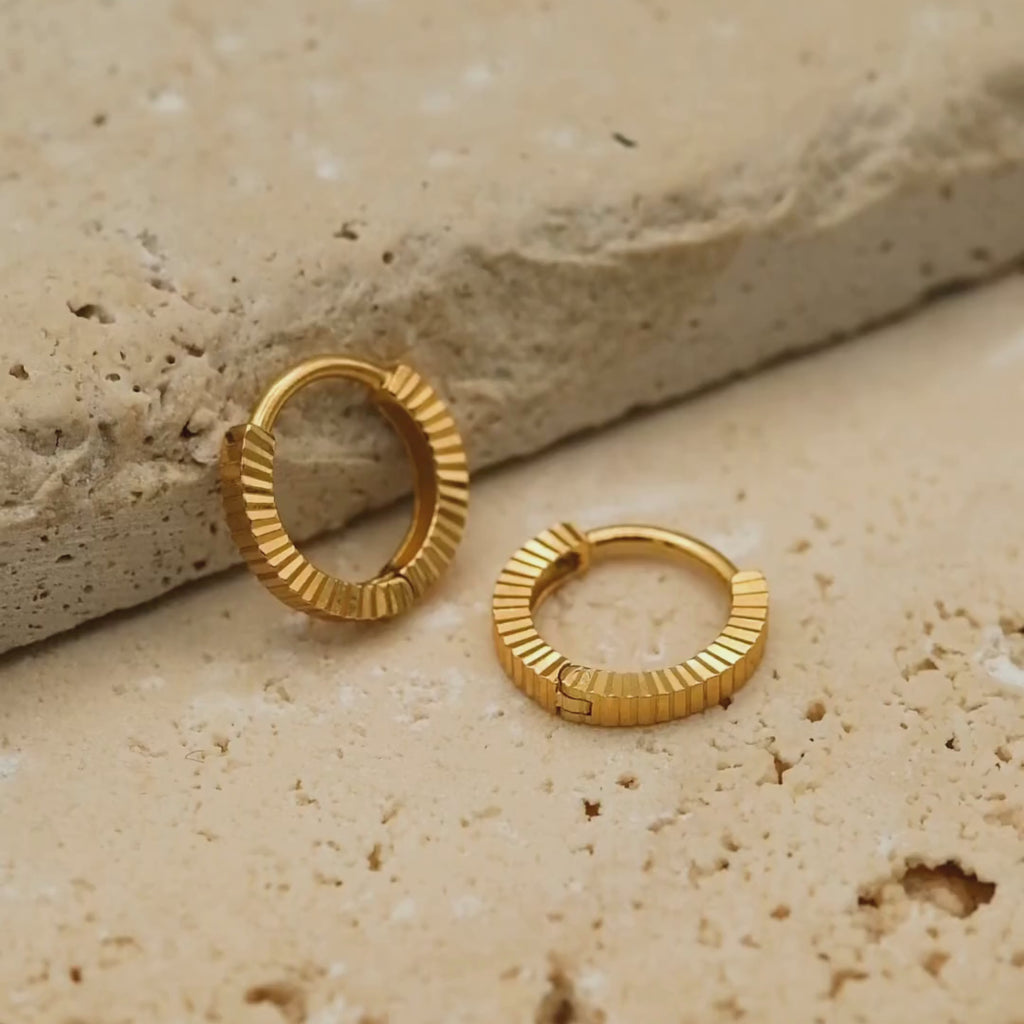 The ribbed texture adds tactile and visual interest beyond smooth hoops, making these perfect for those seeking textured sophistication. The parallel grooves create linear rhythm that's both modern and timeless, elevating the classic hoop silhouette with architectural detail.