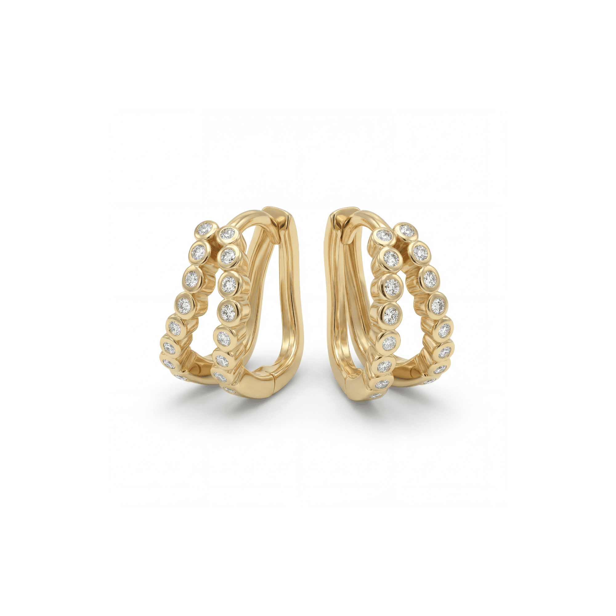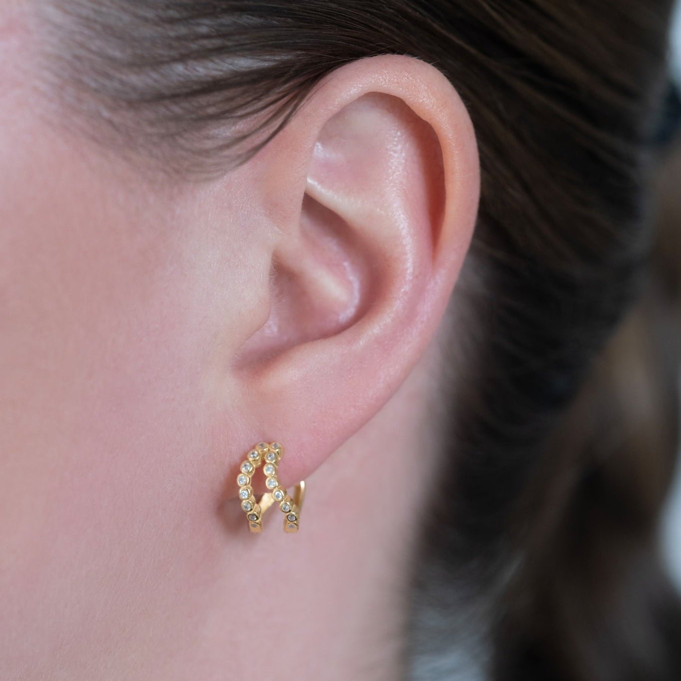 The Elin Double Wave Hoops play with form and dimension through their gently curved wave profile that creates the illusion of two delicate hoops running parallel through the ear – a sophisticated optical effect that perfectly balances lightness with visual impact.